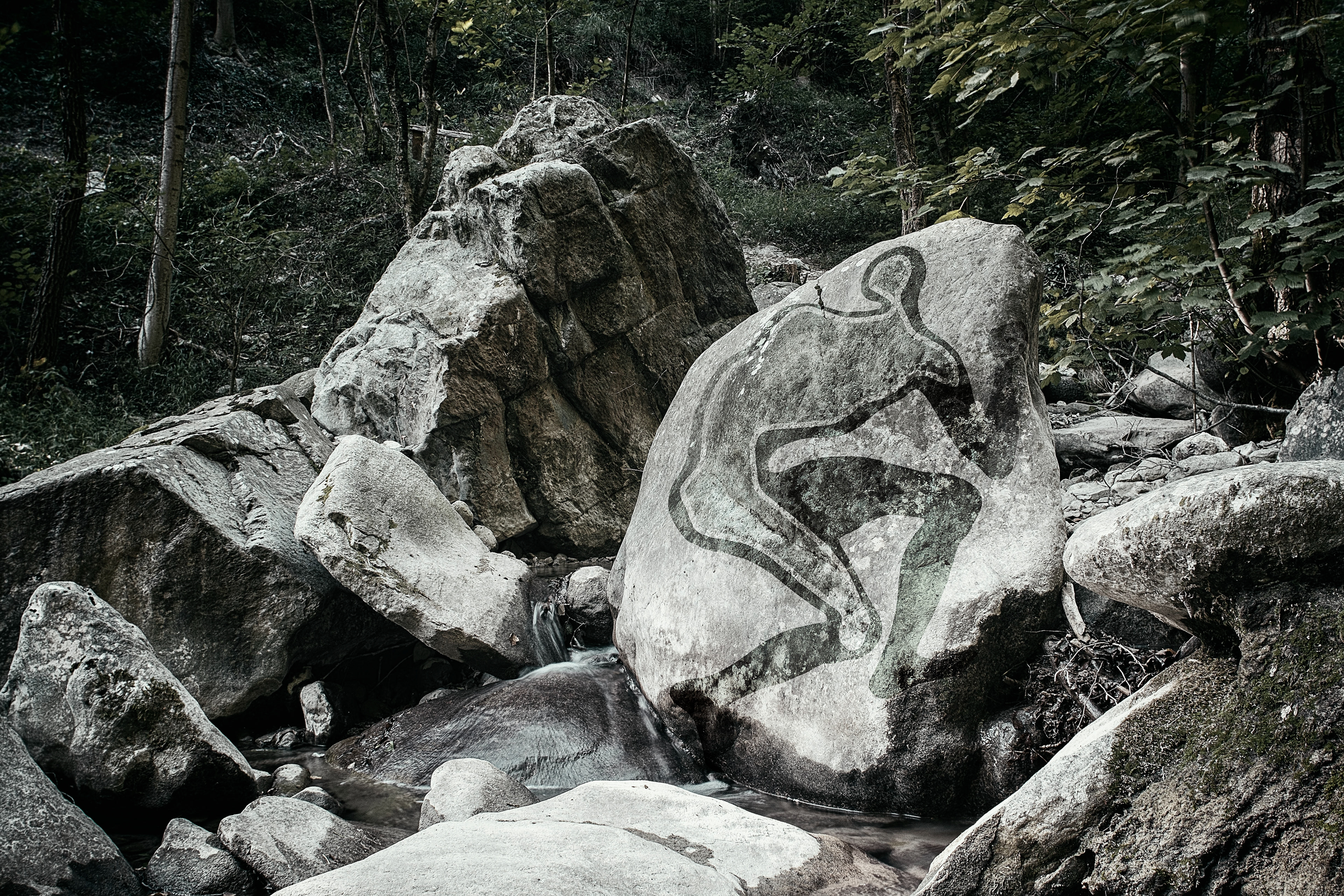 Earth's Bones - Le Ossa della Terra - intervento di arte ambientale temporaneo realizzato su massi erratici scelti lungo al sentiero geologico Giorgio Achermann, Val Ravella, Canzo (Como), Italia. Progetto promosso da ERSAF Regione Lombardia.